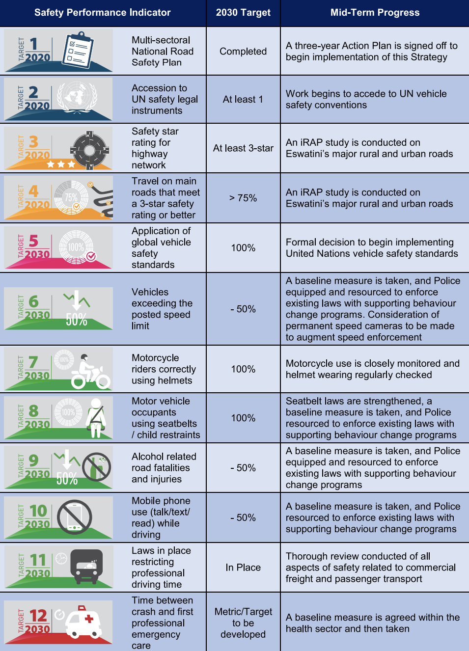 The strategy seeks to curb the rising toll with a focus across all 12 United Nations Global Road Safety Performance Targets. Key performance indicators and mid-term progress targets are outlined, including for Targets 3 and 4 for safer road infrastructure, for the highway network and more than 75 per cent of travel on main roads to achieve a 3-star or better safety rating by 2030.