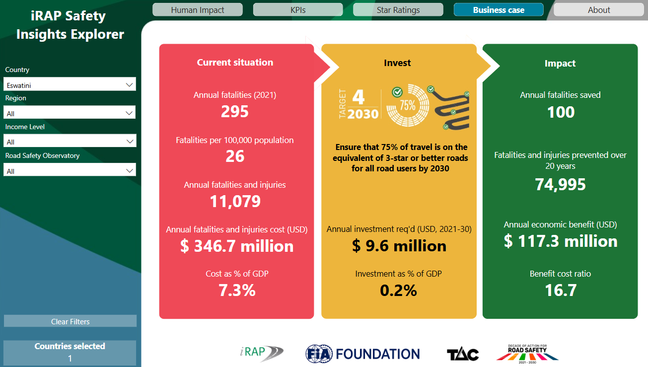 According to iRAP Safety Insights Explorer, by achieving the strategy’s target which would see most travel occurring on 3-star or better roads, Eswatini could prevent 100 deaths annually, and nearly 75,000 deaths and serious injuries over 2 years, with an economic benefit of nearly US $17 for every $1 invested.