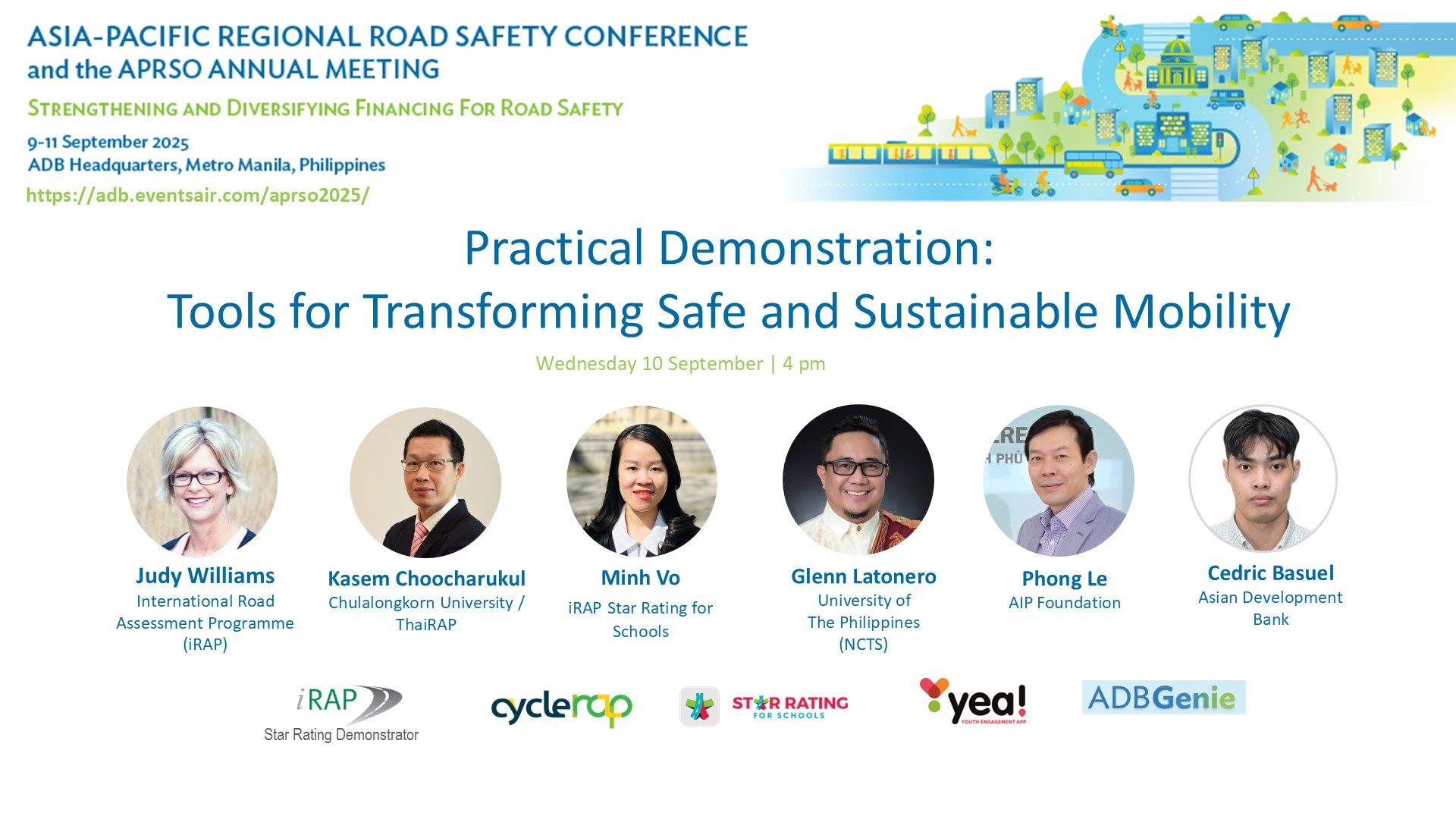 With support from the Japan Fund for Prosperous and Resilient Asia and the Pacific (JFPR) and the High-Level Technology Fund (HLTF), the Conference was organized by the Asia-Pacific Road Safety Observatory (APRSO), the Asian Development Bank (ADB) and the Global Road Safety Partnership (GRSP), with additional support from iRAP, the FIA Foundation, the Embassy of Sweden in Manila, Bridgestone Asia Pacific, and the United Nations Special Envoy for Road Safety.