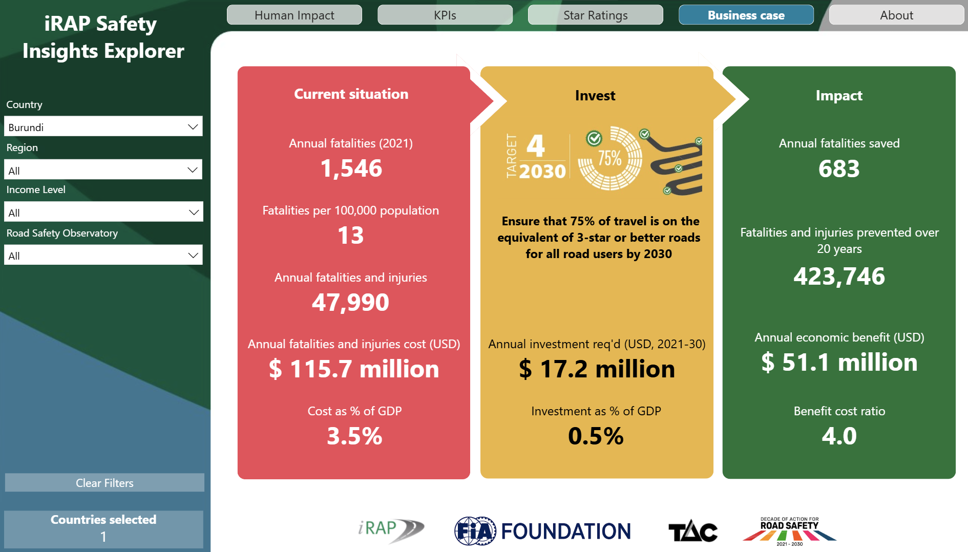 According to iRAP’s Safety Insights Explorer, achieving UN Target 4 for greater than 75% of travel on 3-star or better roads for all road users in Burundi by 2030 stands to save an estimated 683 lives each year and prevent 423,746 deaths and serious injuries over the 20-year life of road treatments with an economic benefit of USD$51.1 million – $4 for every $1 spent.