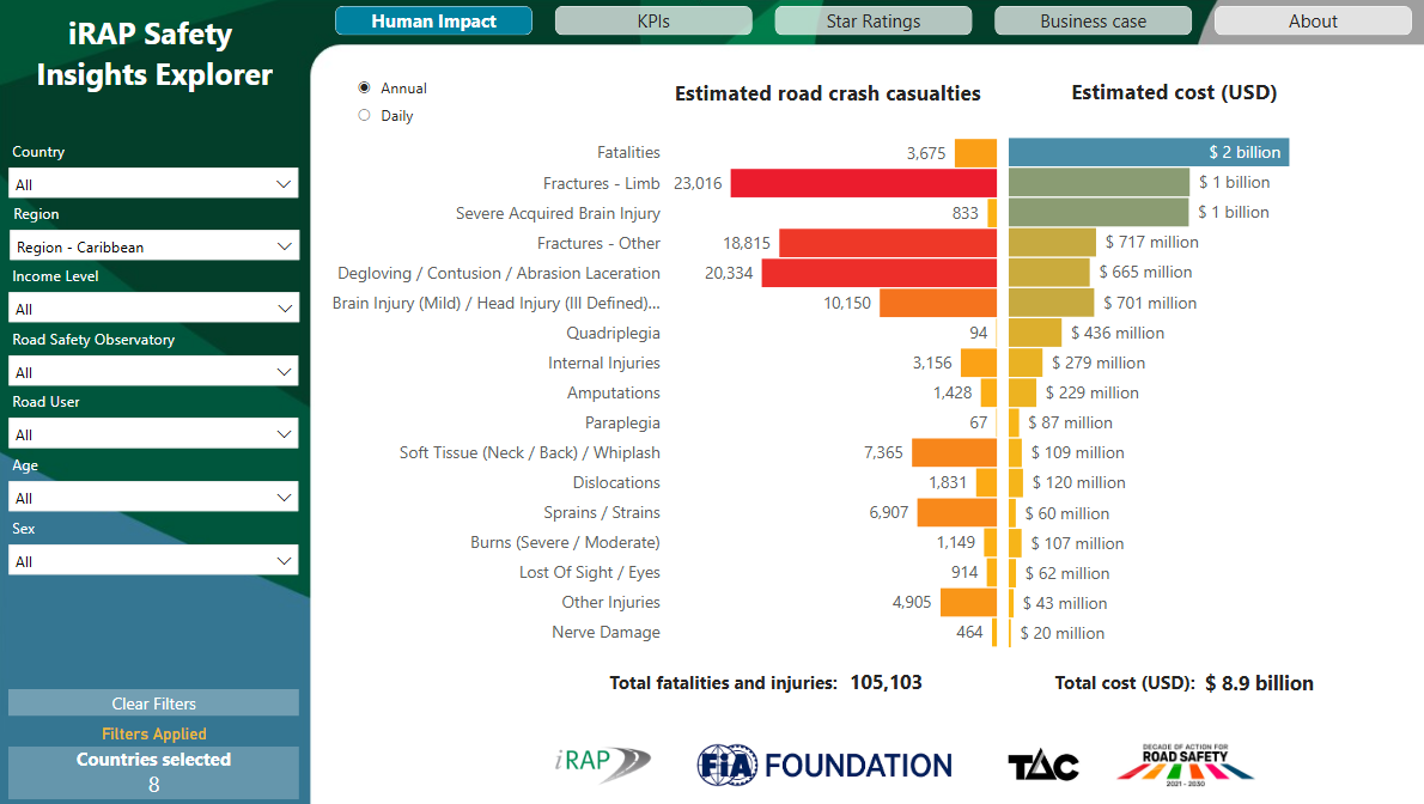 iRAP Safety Insights Explorer shares the human and economic impact of road crashes in the Caribbean and all countries, as well as how safe the roads are for road users, the road attributes that matter, and the Business Case for achieving the majority of travel on 3-star or better rated roads by 2030 (UN Target 4)