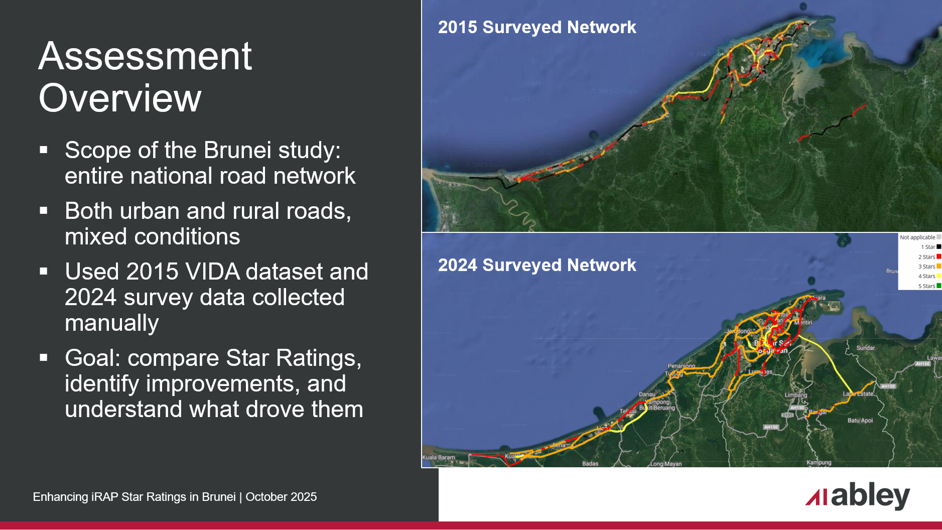In a project funded by the Brunei National Road Safety Council (MKKJR), and managed by Jurusy Perunding Sdn. Bhd. working in conjunction with Abley, the Brunei Department of Roads Services (DOR) Public Works Department undertook comprehensive road safety assessments utilising the iRAP Star Rating Methodology in 2015 and again in 2024.