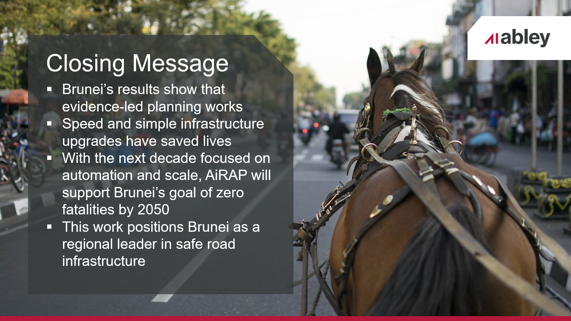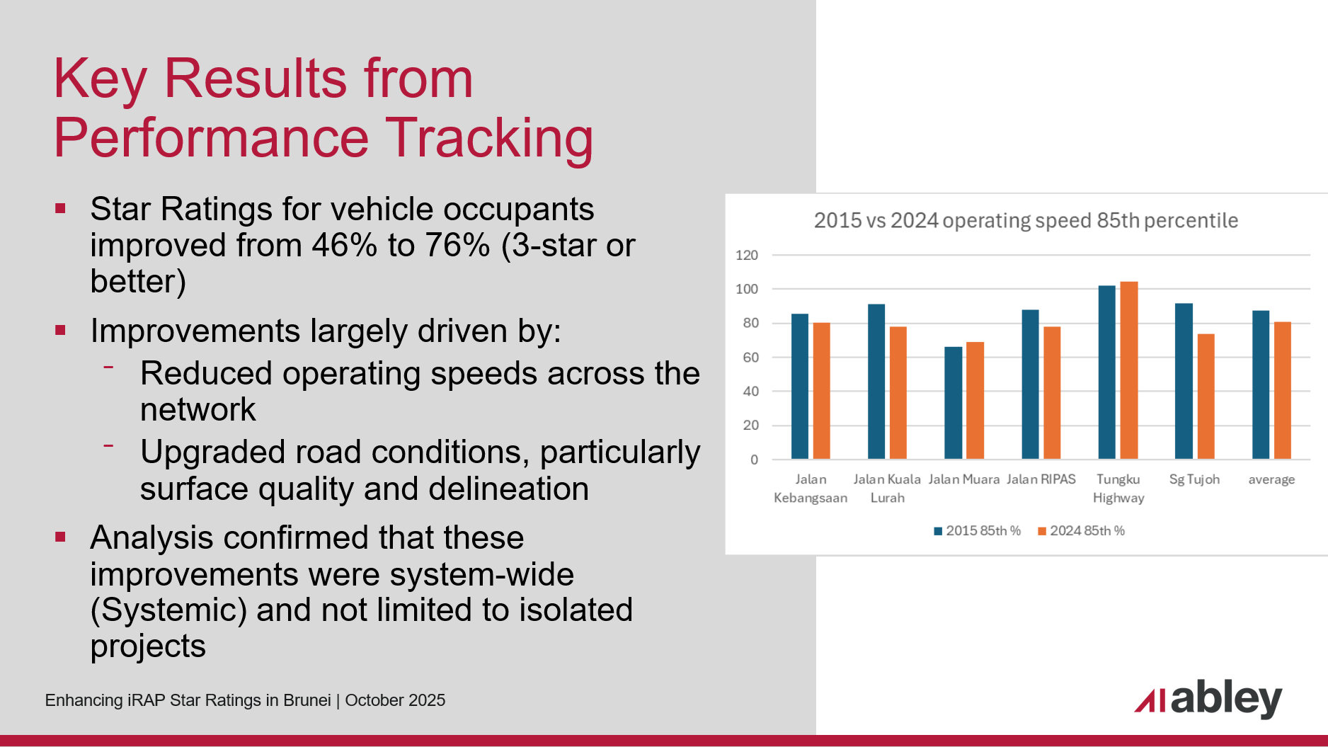 Speaking at the conference, Dr Shane Turner, Technical Director of Road Safety with Abley said, “Brunei’s progress demonstrates the power of evidence-based planning and investment in safer roads. Many countries invest millions of dollars in their roads but never go back to check how much safer they’ve become. Brunei has been an early and committed adopter of the evidence-based iRAP approach, aligning with global best practice. Performance tracking is enabling us to assess the effectiveness of our approach and if we are on-track to meeting Brunei’s road safety targets.”
