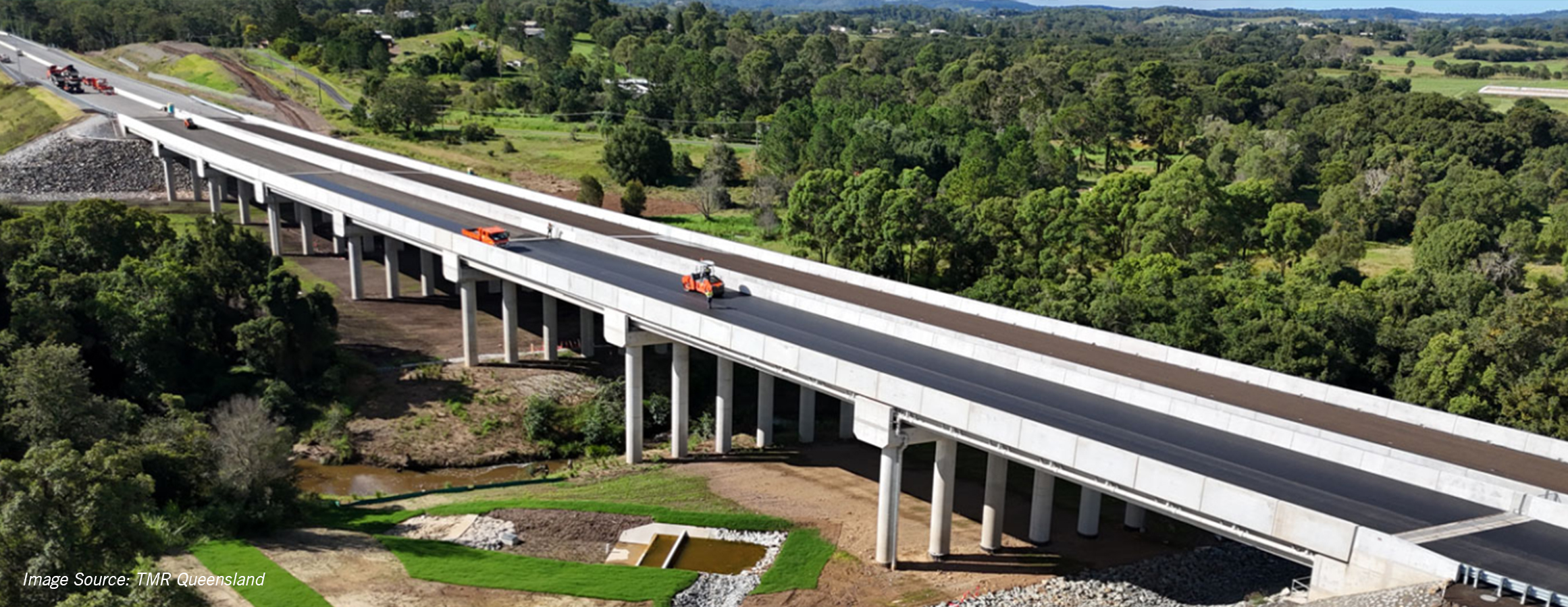 Image source: Australian Transport News – Fully Loaded fullyloaded.com.au/gympie-bypass-now-open-cooroy-to-curra-finally-complete/ – Image details: The Six Mile Creek Bridges of the Gympie Bypass. Image credit: TMR Queensland