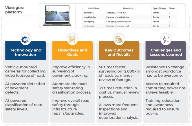 ViaSegura fue desarrollado por el Banco Interamericano de Desarrollo, con el apoyo de iRAP. Utiliza IA, específicamente visión artificial, para detectar automáticamente elementos esenciales de seguridad vial en las carreteras. El modelo se entrenó y probó con 60.000 km de datos viales de Brasil, obtenidos por iRAP. La herramienta es de código abierto y se puede escalar fácilmente a otras ciudades y regiones del mundo. Consulte la información sobre ViaSegura en el informe, páginas 223-224.