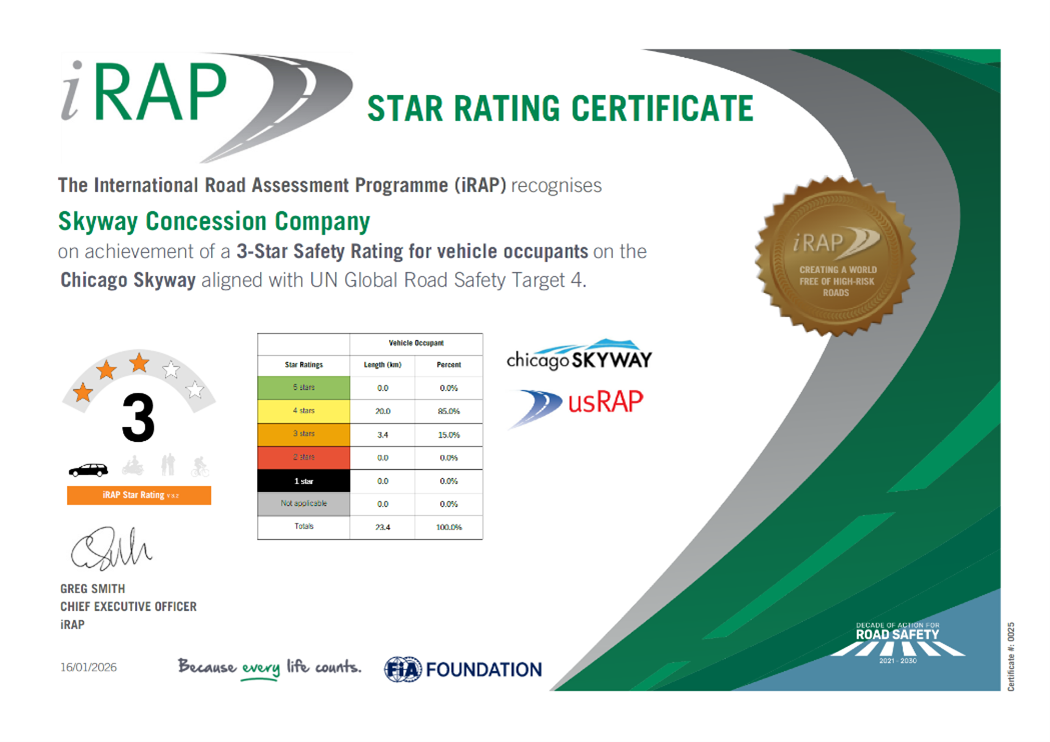 Compañía de concesiones Skyway Ha obtenido la certificación iRAP, que reconoce la seguridad vial del Chicago Skyway, superando el estándar mínimo mundial de seguridad de 3 estrellas o superior para los ocupantes de los vehículos. ¡Cabe destacar que el 85 % de su longitud obtuvo una calificación de 4 estrellas!