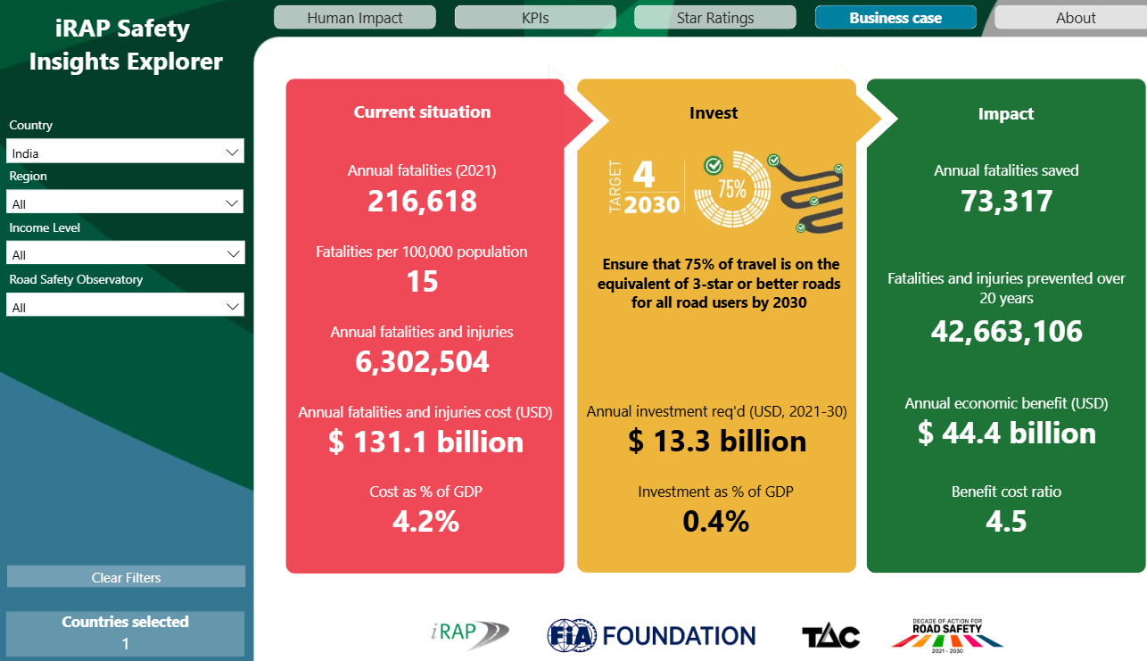 Volgens iRAP's Veiligheidsinzichtenverkenner, achieving UN Target 4 stands to save 73,317 lives each year in India, and an estimated 42,663,106 fatalities and injuries over the 20 year life of road treatments, with an economic benefit to the country of US$44.4 billion – a benefit of $4.50 for every $1 spent.
