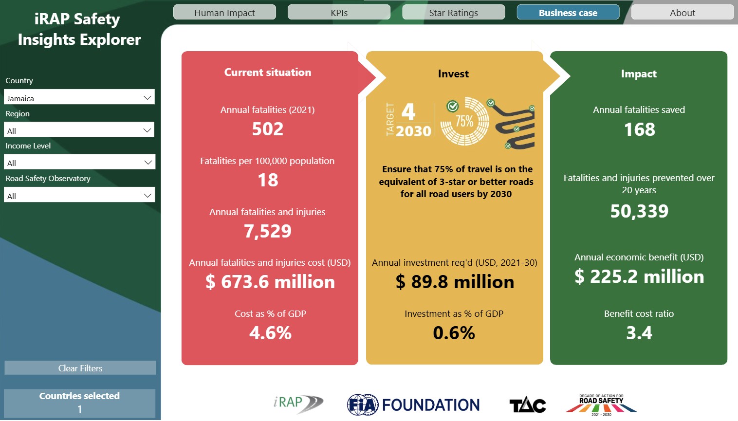 Volgens iRAP's Veiligheidsinzichtenverkenner, Het behalen van VN-doelstelling 4, namelijk meer dan 751 ton aan reizen over wegen met 3 sterren of beter voor alle weggebruikers in Jamaica tegen 2030, zal naar schatting 168 levens redden en 50.339 doden en gewonden voorkomen gedurende de 20 jaar dat de wegbehandelingen nodig zijn, met een economisch voordeel van 1 ton 6 biljoen dollar – 3,40 dollar voor elke 1 ton die wordt uitgegeven.
