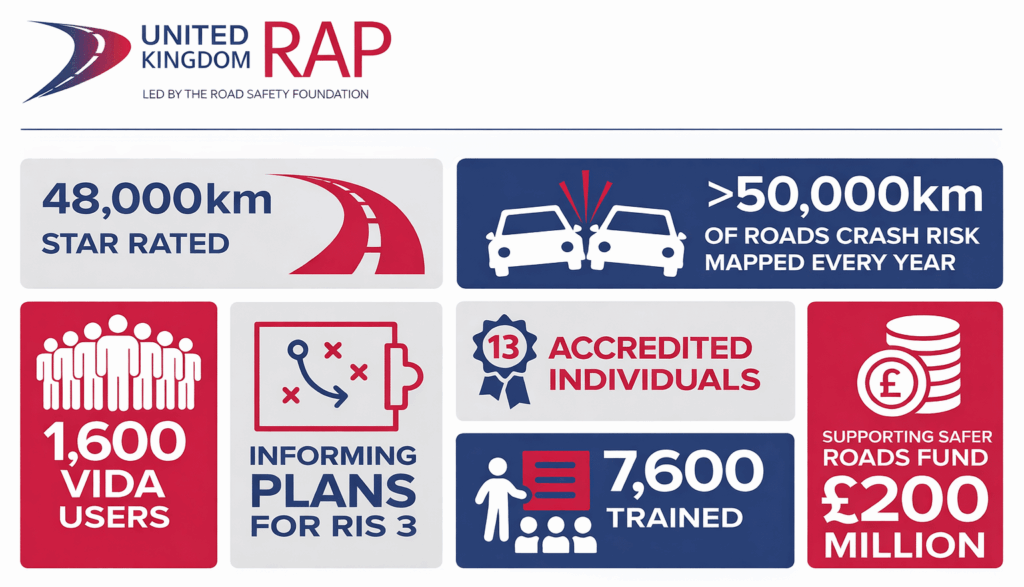 Vương quốc Anh là một trong bốn quốc gia sáng lập chương trình RAP toàn cầu và chương trình RAP của Vương quốc Anh là một hình mẫu toàn cầu. Hàng năm, RSF công bố bản đồ rủi ro tai nạn cho hơn 50.000 km đường cao tốc và đường loại A ở Anh. 48.000 km đường và thiết kế đường đã được xếp hạng Sao. Cục Đường cao tốc Quốc gia thực hiện chương trình xếp hạng Sao iRAP cứ 5 năm một lần và kết quả được công bố năm 2022 cho thấy chỉ số hiệu suất 90% lượt di chuyển trên các tuyến đường đạt 3 sao trở lên vào năm 2020 đã được vượt qua, với 96% đạt được. Cục Đường cao tốc Quốc gia đang sử dụng phương pháp iRAP trong toàn bộ tổ chức để lập kế hoạch chiến lược đầu tư, ưu tiên các tuyến đường cần nâng cấp và đảm bảo các thiết kế đường mới an toàn nhất có thể. Dựa trên phân tích bản đồ rủi ro tai nạn của RSF, Chính phủ đang triển khai Quỹ Đường an toàn trị giá 200 triệu bảng Anh để giải quyết vấn đề an toàn trên 50 tuyến đường loại A địa phương có rủi ro cao nhất ở Anh. Quỹ này đã được trao Giải thưởng An toàn Giao thông Quốc tế Prince Michael năm 2021.