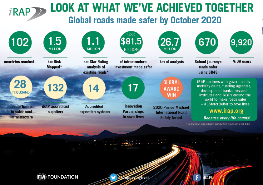 Cứu sống và ngăn ngừa thương tích nghiêm trọng trên các con đường trên thế giới là những gì mà iRAP hướng đến. Với 1,35 triệu người chết và 30-50.000.000 người bị thương mỗi năm, chúng ta cần hành động khẩn cấp ngay bây giờ để mang lại những con đường an toàn hơn cho tất cả những người tham gia giao thông. Tai nạn giao thông đường bộ hiện là nguyên nhân gây tử vong hàng đầu ở những người từ 5-29 tuổi.